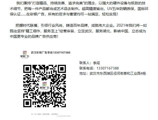 武汉彩银整合广告有限公司于2005年成立,是一家专注于数码喷印领域并自建5000平方喷印车间的专业公司,下设13个部门,共计150人的精英团队,彩银整合广告目前已经成为中国华中地区颇具规模的数码喷印制作中心。企业在发展过程中不断引进国际最先进的数码影像输出设备作为客户提供优质产品的保障,目前拥有JHFR7000proUV卷材打印机6台、飞行船UV同步双面喷印机、UV平板打印机6台、工正高精度喷绘打印机6台、工正5米巨幅喷绘打印机2台、EPSON高清户内写真机20台、Roland高清户外写真机20台、经纬JWE平台式裁切4台、台湾自动拼接机、自动裁切机、海德堡四色印刷机等设备。彩银专注于高端户外广告制作,满足高端客户对高质量广告形象展示的苛刻要求。